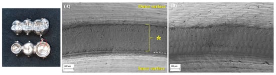 The marginal opening and gap dimensions at four measuring points, according to the milling sequence, are presented with a box-and-whisker plot in Figure 3. The mean MO dimensions of the first-milled and second-milled FDPs were 49 (±28) μm and 59 (±27) μm, respectively, demonstrating a high accuracy of fit that was comparable to those of a previous study []. However, the MO dimension considerably increased from the third milling FDP (172 ± 88 μm) to the sixth milling FDP (278 ± 90 μm), exceeding 120 μm, which is the clinically acceptable margin opening for a single crown [,,,]. The MG and OG milled by using the new bur set marked mean dimensions of 133 (±18) μm and 178 (±35) μm, respectively, which were considerably larger than their MO and AG values. Moreover, they showed a similar trend with the MO dimension, which was significantly increased from the third milling of Ti FDP. However, the mean gap dimension for AG (<40 μm) was unchanged throughout continuous milling for the six FDPs. Figure 4 presents the difference in marginal opening and gap of PMMA provisional FDPs milled between the as-received new burs and the worn burs used for six times milling of titanium FDP in the same CAD/CAM system, indicating a significantly decreased fit accuracy when PMMA FDPs are milled by using the damaged bur set (except for AG). After the sequential milling of six FDPs, severe damage appeared on the cutting edges of all diameter milling burs in scanning electron microscopy (SEM) observations (Figure 5). Figure 6 shows the boundary areas between the inner and outer milling surface at the margins of the first-milled and sixth-milled FDPs.