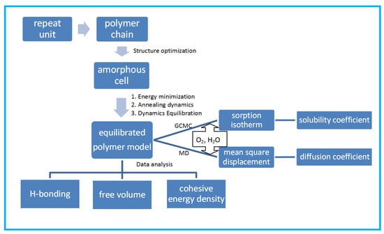 To further improve the barrier properties and develop high barrier polymer films, it is necessary to have a fundamental understanding of the barrier mechanism [32]. However, to clarify the polymer structure and barrier properties at an atomistic/molecular level is experimentally intractable. Fortunately, it has become more convenient to use molecular simulation method to study the relationship between microstructure and macroscopic properties due to the upgrading computational resources. This provides a unique opportunity to study the barrier mechanism of polymers at the molecular level [33,34,35,36]. The parameters related to the barrier properties, such as the size and distribution of free volume, penetrant trajectories, diffusion coefficient, and solubility coefficient can be obtained by molecular simulation [37,38,39,40].