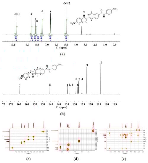 Scheme 1 shows the synthesis process of NAPDA. First, The NAPDN moiety was synthesized by the amidation reaction of 2, 6-naphthalene dicarboxylic acid with 4-nitroaniline diamine, and then the NAPDA was synthesized by reduction reaction of NAPDN. The structures of NAPDA and NAPDN were identifying by using NMR, FTIR and MS. Figure 3 is the 1H NMR spectra, 13C NMR spectra and two-dimensional NMR spectra of NAPDA, respectively. The NMR spectra of NAPDN are shown in Figure S1. As it shown, each proton and carbon was assigned to the NMR spectra of the diamine monomer and the intermediates. The mass spectra and FTIR spectra of NAPDN and NAPDA were shown in Figures S2–S4, respectively. The spectral results are consistent with the proposed molecular structures of NAPDN and NAPDA. All these proved that the diamine monomer NAPDA has been successfully synthesized through amidation reaction and reduction reaction.