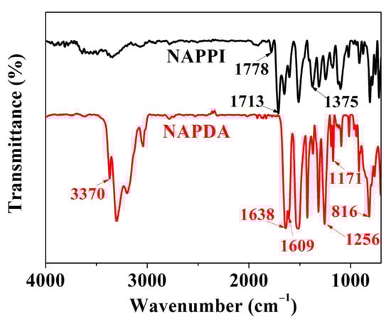 NAPPI follows the synthesis steps shown in Scheme 2. First, the prepolymer NAPAA is formed by ring-opening polymerization, which is completed in DMF using equimolar equivalents of NAPDA and PMDA. Subsequently, the polyimide NAPPI is formed by thermal cyclodehydration. The transition from PAA to polyimide accomplished by continuously heating poly(amic acid)s film from 100 to 400 °C in a vacuum. The FTIR spectrum of NAPPI is shown in Figure 4. The characteristic absorption peak around 1778 and 1713 cm−1 are connected to asymmetric and symmetric stretching of the C=O, respectively. There is an obvious C–N bond stretching vibration characteristic absorption peak at 1375 cm−1, these are typical characteristic absorption peaks of polyimide. In addition, the tensile vibration absorption peak at 3370 cm−1 and bending vibration absorption peak at 1609 cm−1 of N–H bond was not found in the spectrum of NAPPI. These results indicated that the reaction of PMDA and NAPDA was successful, and the PAA was completely converted to polyimide through the imidization reaction.