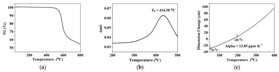 (a) Thermogravimetric analyses (TGA), (b) Dynamic mechanical analysis (DMA), and (c) Thermalmechanical analysis (TMA) curves of the NAPPI film.