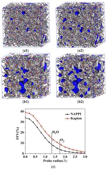 This research is aimed at the barrier properties of oxygen and water vapor of NAPPI and Kapton, the purpose is to understand the available free volume that allows water and oxygen molecules to diffuse through the polymer matrix. Therefore, the kinetic radii of water and oxygen are selected as Connolly probes to estimate the free volume. The morphologies of free volume in NAPPI and Kapton systems are shown in Figure 9. The blue part in the figure represents the free volume of the polymer. It can be seen that the blue part in Figure 9(a1,a2) is significantly less than Figure 9(b1,b2). That means the O2 or H2O accessible free volume of the NAPPI is smaller than that of Kapton. In addition, almost no large voids appear in Figure 9(a1,a2), and there is no obvious interconnected between the voids. Therefore, it is difficult to form a continuous channel for penetrant molecules in NAPPI.