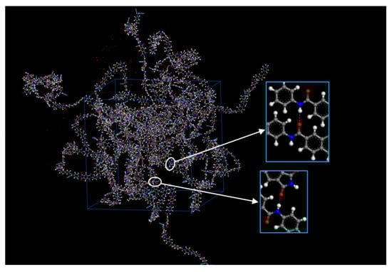 The hydrogen bond interaction in NAPPI was analyzed by MD simulation. From Figure 10, it can be observed that two types of hydrogen bonds are formed. This is because the hydrogen on the amide group may form a hydrogen bond with the oxygen on the amide group and the oxygen on the imide ring. In this study, the hydrogen-acceptor distance less than 2.5 Å were registered as hydrogen bonds. It can be found from Table 4 that 139 hydrogen bonds are formed in NAPPI due to the introduction of amide groups. In addition, Table 4 also shows that NAPPI has a higher cohesive energy density (CED) of 629 J·cm−3, which may be caused by the existence of a large number of hydrogen bonds in the system.