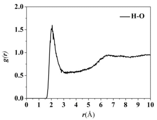 The radial distribution function (gH-O(r)) of H (in amide group) and O (in amide group and imide ring) in NAPPI is used to further confirm the intermolecular interaction; the results are shown in Figure 11. The probability distribution of H and O is given by gH-O(r). A strong peak can be found around 1.8–3.0, and the distance between atoms of 2.6 and 3.1 corresponds to a hydrogen bond, which means that the interaction between the two atoms is likely to be a hydrogen bond [53]. Since the strongest physical force in the intermolecular interaction is the hydrogen bond, the existence of hydrogen bonds can increase the cohesion between chains and make chain packing more compact, thereby reducing the free volume of the polymer, and consolidating the formed crystalline conformation, which is very helpful to improve the barrier property.