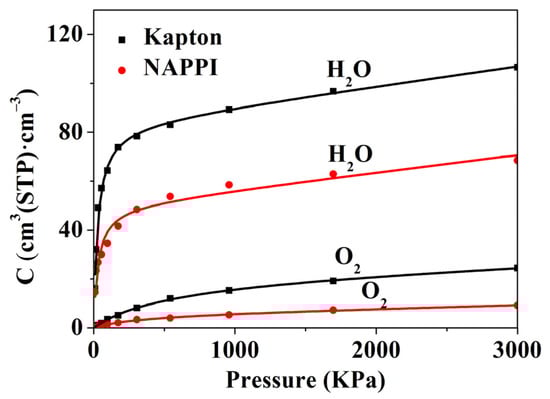 Sorption isotherms of O2 and H2O in NAPPI and Kapton.