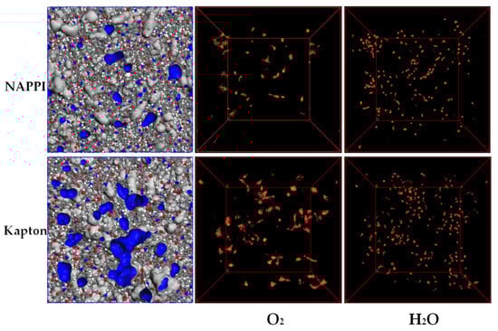 Henry’s law coefficient kD, Langmuir hole affinity parameter b and the capacity parameter were obtained by fitting the sorption isotherm. Then the solubility coefficient was calculated by Equation (7) and summarized in Table 5. The solubility coefficient of H2O and O2 in NAPPI is lower than that of Kapton, the results accord with the sorption capacities. Figure 13 shows the sorption sites of O2 and H2O in NAPPI and Kapton. Obviously, the voids in the film are occupied by gas molecules. Compared with Kapton, the sorption loading of O2 and H2O in NAPPI is lower. This is consistent with the result that NAPPI has a smaller fraction free volume and voids size. In addition, it can be found that there are more sorption sites for H2O than O2 in NAPPI. This is mainly caused by two reasons. Firstly, the size of H2O is smaller than O2, and more importantly, because NAPPI contains a large amount of amides groups with strong affinity for H2O, it is easy to form hydrogen bonds with water molecules, which will facilitate the sorption of H2O. The amide group in NAPPI can interact with water molecules through strong hydrogen bonds, so that the water molecules may be “locked” in the film, which will greatly limit the diffusion of water molecules in the film. Moreover, the locked water molecules may occupy the voids in the polymer to further reduce the free volume, which helps to improve the barrier properties of the film [29,30,31].
