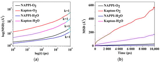 Figure 14a shows the MSD as a doubly logarithmic plot. By checking the slopes of the functions Log(MSD) and Log(t), it can be found that the slopes (k) of the four curves have all become one after a period of time, implying the occurrence of Einstein diffusion, which proves that Equation (8) is applicable. Figure 14b shows the MSD as a function of time for O2 and H2O in NAPPI and Kapton films, and the calculated diffusion coefficients are presented in Table 5. It can be seen that H2O and O2 have lower mobility in NAPPI film, and the diffusion coefficient of H2O and O2 in NAPPI is much lower than that of Kapton, which are 2.2 × 10−8·cm2·s−1 and 5.2 × 10−8·cm2·s−1, respectively. This indicates the diffusion of gas molecules in NAPPI is much more difficult than that in Kapton.