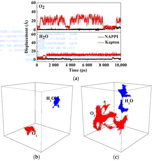 (a) Displacement and trajectories of H2O and O2 in (b) NAPPI and (c) Kapton.