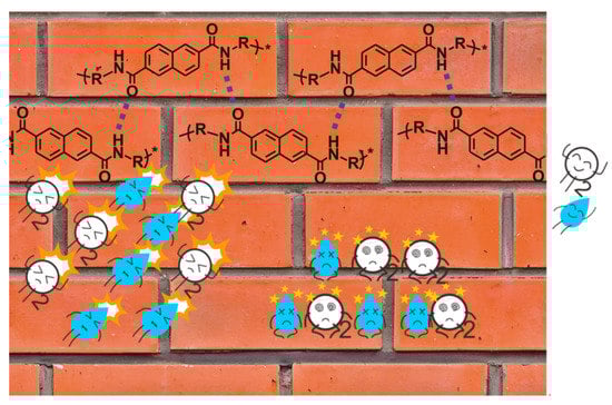 The barrier mechanism of NAPPI can be conceptually metaphorized as the “wall” shown in Figure 16. The rigid naphthalene ring is assumed to be a “brick”, the strong hydrogen bond interaction formed between the amide groups can be regarded as “cement”. Driven by the strong intermolecular interaction formed by amide groups, polymer chains containing rigid naphthalene rings can be regularly arranged and tightly packed, just like stacking bricks into an orderly and sturdy wall under the bonding of cement. This is reflected in the smaller interplanar distance and free volume of NAPPI. The characteristic of NAPPI film to prevent gas from penetrating can be metaphorized as most gas molecules are blocked outside the “wall”, a small part of gas molecules are trapped in the “wall”, and only a few gas molecules can successfully pass through the “wall”. Although the actual arrangement of polymer chains cannot achieve this idealistic state, it is also helpful to understand the barrier mechanism of NAPPI.