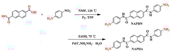 2, 6-naphthalenedicarboxylic acid (purity: 99%, J&K Scientific Ltd., Beijing, China), 4-nitroaniline (purity: 99%, Aladdin Reagent Co., Ltd., Shanghai, China), 10% palladium on carbon (10 wt% Pd/C, Alfa Aesar Chemical Co., Ltd., Shanghai, China), triphenyl phosphate (TPP, purity: 98%, Macklin Biochemical Co., Ltd., Shanghai, China), argon (purity: 99.999%, Hualong Special Gas Co., Ltd., Zhuzhou, Hunan, China), nitrogen (purity: 99.999%, Hualong Special Gas Co., Ltd., Zhuzhou, Hunan, China) and hydrazine monohydrate (NH2NH2·H2O, purity: 95%, J&K Scientific Ltd., Beijing, China) were used directly without further treatment. Pyromellitic dianhydride (PMDA, Alfa Aesar Chemical Co., Ltd., Shanghai, China) and 4, 4′-diaminodiphenyl ether (ODA, Alfa Aesar Chemical Co., Ltd., Shanghai, China) was heated at 125 °C in vacuum for 4 h prior to use. N-Methyl pyrrolidone (NMP), dimethylformamide (DMF), methanol, ethanol and pyridine (Py) were purchased from Guangzhou Chemical Reagent Factory (Guangzhou, Guangdong, China), before use, all solvents was dehydrated with molecular sieves.