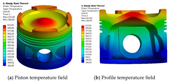 The three-dimensional geometric model of the piston is established, the boundary conditions such as temperature and pressure in the cylinder are calculated by using the working process model of the diesel engine []. The temperature field of the piston is obtained with the finite element method, as shown in Figure 1. The finite element results in this article were obtained by the software of ANSYS 19.0 produced by ANSYS, Inc. (Canonsburg, PA, USA).