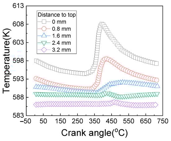 Meanwhile, the change rule of the temperature of the monitoring points, which is at different depths from the piston top, with the crankshaft rotation angle in a work cycle of the diesel engine is calculated, as shown in Figure 2.