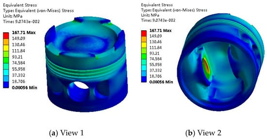 As can be seen from Figure 4, the maximum thermo-mechanical coupling stress of the piston is 167.71 MPa and is mainly distributed in the inner and upper areas of the piston pinhole. The piston pin is connected to convert the energy generated by combustion in the cylinder into the kinetic energy for crankshaft rotation, so the force is larger. At the corner of the inlet and exhaust valve groove on the top surface of the piston, the thermo–mechanical coupling stress is also large. This is because the corner is subjected to a large heat load (large heat flow) and a mechanical load (gas burst pressure in the cylinder) and has a stress concentration phenomenon by the chamfering without a smooth transition.