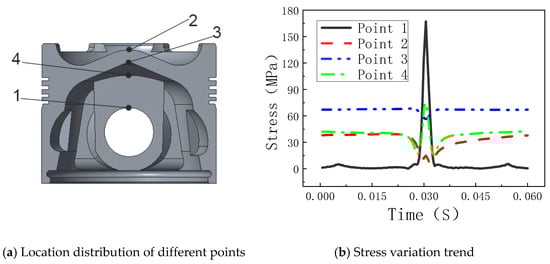Change rule of the coupling stresses at different points in the piston with time. (a) Location distribution of different points; (b) Stress variation trend.