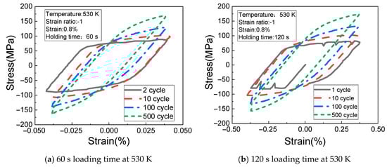 Figure 6a,b shows the change rules of the cyclic stress (measured at the temperature of 530 K, the strain of 0.8%, the strain ratio of −1, and the creep load holding time of 60 s and 120 s) with the cyclic strain. It can be seen from the figures that the stress fluctuation occurs in the first cycle of the material when the load holding time is 120 s, and the stress fluctuation gradually disappears with the increase of cycle times. At the same time, the maximum tensile stress and the maximum compressive stress of the material increase with the number of cycles, and the stress relaxation appears at 120 s holding time at 100 cycles.