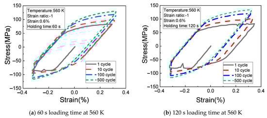 Figure 7a,b shows the change rules of the cyclic stress (measured at the temperature of 560 K, the strain of 0.6%, the strain ratio of −1, and the creep loading time of 60 s and 120 s) with the cyclic strain. It can be seen from the figures that the stress fluctuation of the material in the first cycle still does not disappear, and the stress relaxation is gradually obvious.