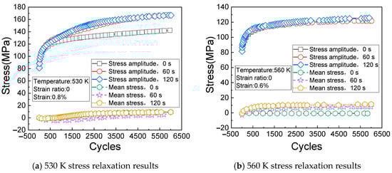 Stress relaxation results at 530 K and 560 K. (a) 530 K stress relaxation results; (b) 560 K stress relaxation results.