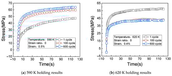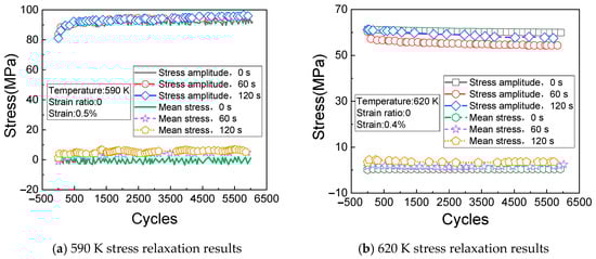 Stress relaxation results of holding at 590 K and 620 K. (a) 590 K holding results; (b) 620 K holding results.