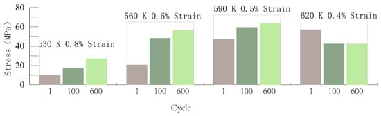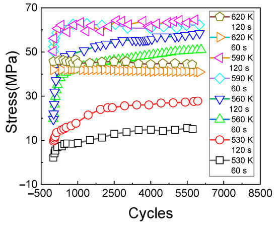 It can be seen from Figure 13a,b that the stress relaxation amplitude of the material increases with the increase of cycles and holding time; under the test conditions in which the temperature is 620 K and the strain is 0.4%, the stress of the first cycle is larger. When the 600th cycle is reached, the response stress of the material tends to be stable with the extension of the holding time, indicating that stress saturation occurs at this time.
