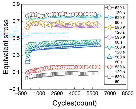 Under the conditions of different temperatures and loading times, the change rule of the equivalent relaxation stress with the cyclic times is shown in Figure 11. It can be seen from Figure 11 that, different from Figure 10 in which the relaxation stress at a higher temperature (620 K) is less than that at a lower temperature (590 K), the equivalent relaxation stress increases with the increase of temperature, which shows that the material viscosity increases with the increase of temperature. It can also be seen from Figure 10 that the longer the creep holding time is, the greater the stress relaxation amplitude is.