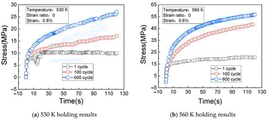 Stress relaxation results of holding at 530 K and 560 K. (a) 530 K holding results; (b) 560 K holding results.