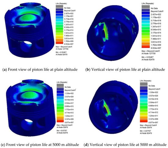 The piston fatigue life under 5000 m altitude and plain conditions is calculated and analyzed using the fatigue life prediction method based on the NLTS algorithm, combined with the piston finite element model, and the results are shown in Figure 16.