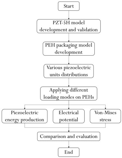 In this study, the piezoelectric energy harvesting efficiency of the PEH is further investigated using FE method. A flowchart as shown in Figure 1 is provided to clearly exhibit the simulation and analysis process in this study.