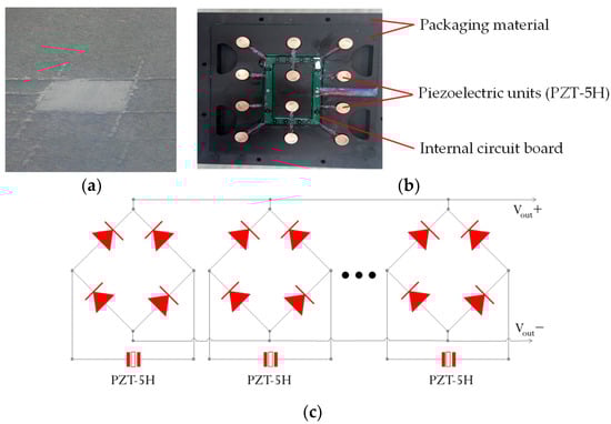 Prototype of the piezoelectric energy harvester (PEH) [23,24]: (a) PEH installation in pavement; (b) Details of PEH inside design; (c) Connection of the piezoelectric units.