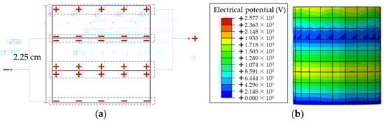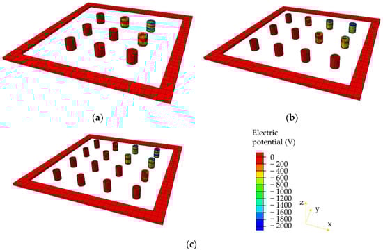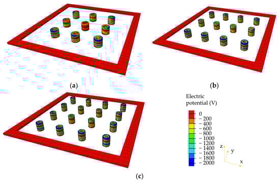 Electrical potential distributions in piezoelectric units under full loading condition: (a) 3 × 3 with diameter = 2 cm; (b) 3 × 4 with diameter = 1.73 cm; (c) 4 × 4 with diameter = 1.5 cm.