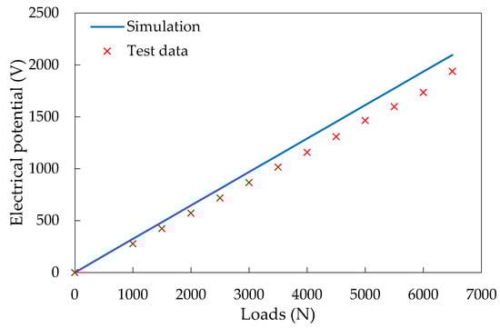 Before assembling the piezoelectric units into the PEH in the simulation, it is necessary to create the FE model of the piezoelectric unit first and verify the reliability of simulating its piezoelectric performance. To this end, the laboratory compressive loads were applied on the piezoelectric unit. The test was performed by the universal servo hydraulic test device (Cooper HYD25-II), which can randomly set the temperature and provide sinusoidal loads. During the tests, the sinusoidal loadings ranged from 1 to 6.5 kN with the interval of 0.5 kN were applied under loading frequency of 10 Hz and temperature of 20 °C [23]. Meanwhile, the FE model of the piezoelectric units was established in ABAQUS. The loading and boundaries conditions were defined as same as laboratory ones. The material parameters will be introduced in the next section. One example of the computational result is shown in Figure 4b. The distribution of the electrical potential is illustrated. In addition, Figure 5 compares the values of open-circuit current voltage from laboratory and the electrical potential from simulation.