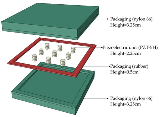 In the FE simulation of the PEH, the packaging and piezoelectric materials were modeled. To clearly exhibit the overview for a PEH FE model, Figure 6 shows the detailed constituents of the PEH model. In this model, tie bonding was assumed between packaging materials and between package and piezoelectric units, and therefore no slips and separations will occur.