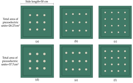 Piezoelectric unit distributions in PEH by: (a) 3 × 3 with diameter = 2 cm; (b) 3 × 4 with diameter = 1.73 cm; (c) 4 × 4 with diameter = 1.5 cm; (d) 3 × 3 with diameter = 2.3 cm; (e) 3 × 4 with diameter = 2 cm; (f) 4 × 4 with diameter = 1.73 cm.