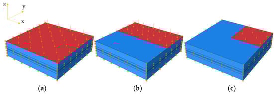 Loading modes on the PEH: (a) full loading; (b) half loading along y-direction; (c) quarter loading.