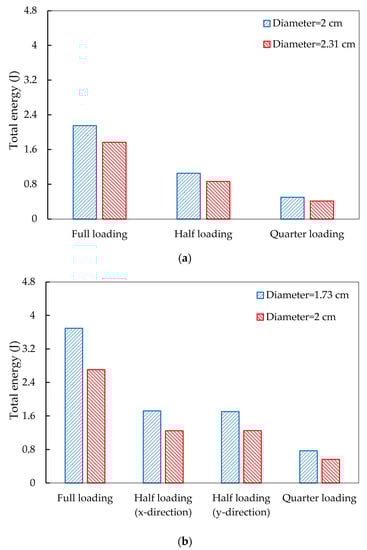 It can be observed that higher electrical energy can be produced by piezoelectric units with smaller diameters. The total electrical energy production is linearly related to the loading conditions, i.e., the PEHs under half and quarter loading modes produced around half and quarter energy of that produced under full loading mode. For the piezoelectric units in 3 × 4 distribution, the total energy productions under half loading along x-direction and y-direction are equivalent. In addition, even the total cross section areas of the piezoelectric units are equivalent, the electrical energy production still shows large difference when the PEHs are under the same loading conditions. For instance, when the total cross section areas of the piezoelectric units are 28.27 cm2 (3 × 3 distribution with 2 cm diameter, 3 × 4 distribution with 1.73 cm diameter and 4 × 4 distribution with 1.5 cm diameter), however, they produced 2.15, 3.69, and 4.15 J electrical energy under full loading condition, respectively. This phenomenon can be explained by the stress distribution variations. According to Equation (3), the electrical energy is dependent on the stress response of the piezoelectric unit. Therefore, although the total cross section areas of the piezoelectric units in the three PEHs are equivalent, the stress conditions on units are different due to various distributions, and thus generate difference electrical energy.