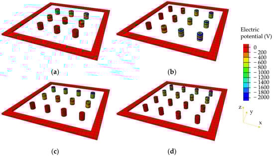 Electrical potential distributions in piezoelectric units under half loading condition: (a) 3 × 3 with diameter = 2 cm; (b) 3 × 4 with diameter = 1.73 cm, along x-direction; (c) 3 × 4 with diameter = 1.5 cm, along y-direction; (d) 4 × 4 with diameter = 1.5 cm.