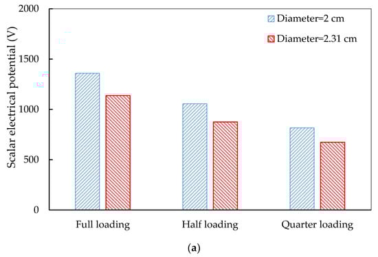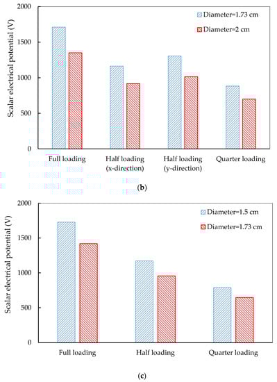 The electrical potential distributions within the piezoelectric units are, respectively, presented in Figure 10, Figure 11 and Figure 12. Only the models with smaller diameters (2, 1.73, and 1.5 cm) are compared here under the three loading modes. It can be observed that the electrical potential exhibits extremely non-uniform distribution in the PEHs. Piezoelectric units near the edges show relatively higher electrical potential than those in the centers of the PEHs. The aforementioned phenomenon can be explained by the stress concentration in the piezoelectric units near the edge. The stiffness of the piezoelectric units (PZT-5H) is much higher than that of the packaging and sealing materials (PA66-GF30 and rubber), and therefore, higher stress concentrations mostly exist in the units near the edge. Under the half and quarter loading conditions, even though the electrical potential in the piezoelectric units beyond the loading area is almost zero, very high electrical potential still appears near the edge of PEHs. These results indicate that the current PEH design will cause large difference in the electrical potential between different piezoelectric units, especially under the non-uniform loading conditions. The similar distributions of the electrical potential can be found in the other three models with larger diameters (2.31, 2, and 1.73 cm).