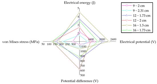 To evaluate the piezoelectric effects of different PEHs, a radar chart was provided in Figure 14, in which the output electrical energy, electrical potential, potential difference, and von Mises stress of the PEHs under the full loading mode were exhibited.