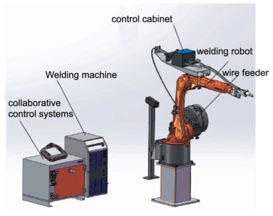 Welding robots are one of the most commonly used industrial robots, widely used in the fields of automobiles, electronics, and manufacturing. The use of welding robots can achieve precise control of motion parameters and motion trajectories, and solve the complex problem of arc additive structure trajectory control. Therefore, welding robots have been attracting increasingly more attention by researchers. The robot WAAM platform is mainly composed of welding robots, welding machines, collaborative control systems, control cabinets, and welding workbenches, as shown in Figure 5.