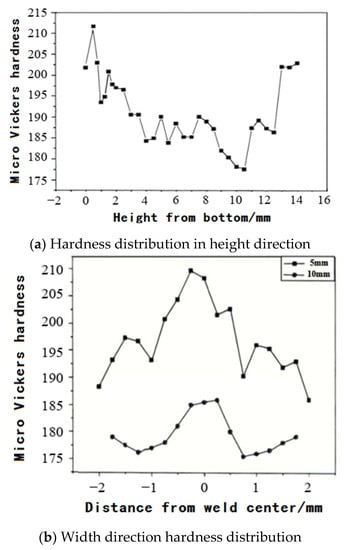 The Wang Kehong team of Nanjing University of Science and Technology used the HVS1000-Z microhardness tester to measure the hardness value along the center line of the weld along the center line of the weld with the increase in the cladding height and the hardness value at different width positions at the same height when the load was 0.3 kg. As shown in Figure 6, the hardness distribution of the cladding layer had obvious laws: The higher the height, the greater the hardness, and the lower the middle part; the hardness at the center of the weld was high, and the hardness on both sides of the weld was low [61].