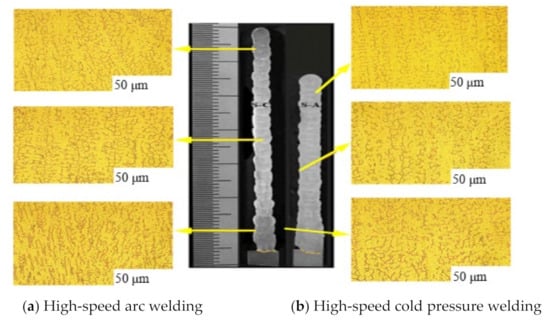 The Xue Jiaxiang team of South China University of Technology compared the two WAAM processes of high-speed arc welding and high-speed cold pressure welding. The two types of microstructures are shown in Figure 7. Observing the micrographs of the two specimens, it is known that the heat input of high-speed arc welding is high, and the heat accumulation is large, which causes part of the ferrite to melt in the austenite, and the dendrite spacing is large, which also indicates the additive of high-speed arc welding. The tensile strength of the pieces is higher [62].