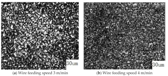 Xianghui et al. studied the microstructure of additive parts by changing the wire feeding speed, as shown in Figure 8. When the wire feeding speed was increased from 3 to 4 m/min, the arc power also increased. The increase in heat input caused the cooling rate of the back edge of the molten pool to decrease, and the distance between the secondary dendrites increased. Therefore, as the wire feeding speed increased, the dendrite size became larger and the tensile strength decreased [63].