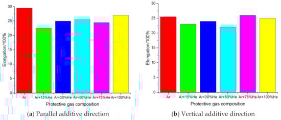 Jianjun et al. found in the preparation test of Ti-6Al-4V thin-walled parts that as the heat input of each weld pass during the deposition process decreased, the average yield strength (YS), tensile strength (UTS), elongation, and growth rate increased significantly [28]. Ping et al. reached a similar conclusion on the research of the TIG additive preparation of Ti-6Al-4V molded parts. As the welding current decreased and the welding speed increased, the tensile strength of the molded parts increased. As the cooling time increased, the strength and plasticity of the material improved [29]. Ning of Harbin Institute of Technology found that the increase in welding current and the decrease in welding speed will lead to the growth of the grains of the Ti-6Al-4V molded parts in arc surfacing welding, the formation of massive α phases, and even the formation of coarse clusters. Increasing the cooling time between layers and appropriately increasing the wire feeding speed can homogenize the organization, eliminate the cluster organization, and effectively reduce the material anisotropy [30]. Åkerfeldt et al. found that a faster cooling rate during the deposition process usually makes the material structure show a finer microstructure, thereby increasing the yield strength and tensile strength of Ti-6Al-4V molded parts, but reducing the plasticity [31]. Brandl et al. found that furnace cooling aging heat treatment at 600 °C for 4 h can significantly increase the hardness of Ti-6Al-4V molded parts; furnace cooling and solution treatment at 1200 °C for 2 h can make the columnar β crystal equiaxed. The band characteristics disappear and the hardness decreases [32]. Wauthle et al. found that stress-relieving heat treatment of Ti-6Al-4V molded parts can effectively promote the transformation of the α martensite into equilibrium phase α lamella, while hot isostatic pressing treatment can transform the structure into isotropic lamellar. The α + β phase of the product can effectively improve the plasticity of the molded part [33]. Brandl et al. used high-temperature solution + quenching + annealing heat treatment of titanium alloy-molded parts, and found that a large number of columnar β crystals in the structure of Ti-6Al-4V-molded parts transformed into spheres, and the material isotropy of the molded parts greatly increased [34]. The research by Zhi et al. showed that ultrasonic impact can effectively transform the columnar crystals in the structure of WAMM titanium alloy moldings into equiaxed crystals, thereby eliminating the anisotropy of the moldings and optimizing the overall performance of the moldings [35]. Bermingham et al. added a trace amount of boron during the forming process, and found that the α grain boundary and cluster structure in the formed part were significantly reduced, but the number of α equiaxed crystals increased instead, which significantly reduced the anisotropy [36].