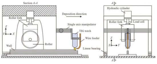 - Mcandrew, A.; Alvarez, R.; Colegrove, P.; Honnige, J.; Ho, A.; Fayolle, R.; Eytayo, K.; Stan, L.; Sukrongpang, P.; Crochemore, A.; et al. Interpass rolling of Ti–6Al–4V wire+arc additively manufactured features for microstructural refinement. Addit. Manuf. 2018, 21, 340–349. [Google Scholar] [CrossRef]