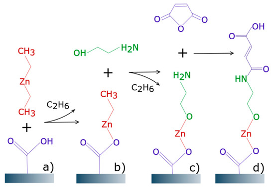 MLD (molecular layer deposited) reaction scheme: (a) Diethyl zinc (DEZ) reacting with surface hydroxyl group coming from the previous cycle; (b) ethanolamine (EA) reacting with ethyl surface group; (c) maleic anhydride (MA) ring-opening reaction; (d) monolayer formed after one MLD cycle.