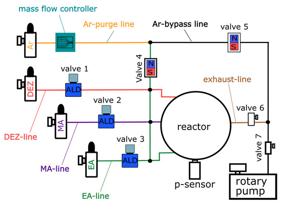 The MLD setup, previously described [2,3], was modified in order to accommodate three precursors: DEZ, EG, and MA (all obtained from Sigma Aldrich, St. Louis, MO, USA). The MLD setup scheme is illustrated in Figure 2. The thin films were deposited on single-side polished c-Si (100) substrates (Siegert Wafer, Aachen, Germany). An in-house programmed software [9] was used for automating the deposition process, allowing the precise control of the ALD valves (Swagelok ALD3, Solon, OH, USA) employed to define the precursor exposure and purging times during the MLD process (see Figure 2: Valve 1–3). During the deposition, a simple rotary vane pump (RVP, Pfeiffer DUO 005 M, Aßlar, Germany) was used for evacuation, while Ar was constantly flown into the system using a mass flow controller (MKS MF1-C, Andover, MA, USA) driven by the automation platform (MKS PAC 1000, Andover, MA, USA). Using an Ar flow rate of 16 sccm resulted in a process pressure of 0.5 Torr. A special attention was paid to a proper heating of the whole setup in order to avoid condensation of the precursor vapors inside the reaction chamber, which would cause unwanted chemical vapor deposition (CVD)-like growth, resulting from the reactions of the different precursors in the gas phase and subsequent deposition onto the substrate. The system temperatures are listed in Table 1. The relatively low temperature of the sample stage (60 °C) was chosen to favor the adsorption of the organic precursors, especially EA.