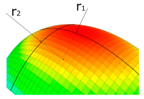 Liquid surface with two perpendicular surface trajectories of curvature r1 and r2.