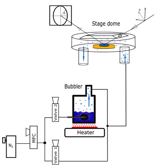 The experimental setup for the EP measurements is illustrated in Figure 5. To vary the relative humidity in the atmosphere surrounding the samples to be measured, nitrogen is flown through a custom-made water bubbler into a dome surrounding the sample. By varying the opening ratio between valve 1 and valve 2, the amount of nitrogen going through the bubbler/bypass can be adjusted changing the RH inside the sample dome. Using this procedure, a maximum RH of 85% can be reached inside the dome. For further increase, the bubbler must be heated. In a typical EP experiment, the RH humidity is increased from 0 to 100% and measured with a sensor inside the sample dome. Simultaneously, the changing refractive index of the sample is measured via ellipsometry thanks to two transparent windows in the sample dome.