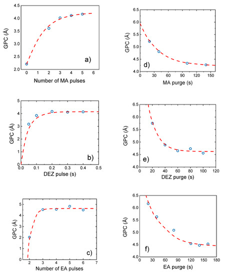 The saturation curves display the GPC as a function of the precursor exposure and purging times (texp and tpurge, respectively). The measured data points for the purging and precursor exposure times were fitted with an exponential decay and saturation-type exponential functions, respectively. This allowed the extrapolation of the GPC in the saturation regime of each curve as the limit of the according function. In case of EA and MA, multiple shorter pulses, respectively with a pulse time of 1.5 s and 0.1 s, were used in a single precursor exposure step (see Figure 6). A delay time of 10 s between the single short pulses was chosen. This approach simply allowed for a more precise control of the precursor dosing compared to a very long single exposure step. During longer exposure steps the pressure inside the precursor vessels falls far below the desired vapor pressure, complicating the exact control of the precursor dosing. This effect can be avoided with multiple subsequent MA pulses (Figure 6). Within the DEZ exposure step, the duration of one single precursor exposure time was varied. In case of DEZ this was possible since the gas pressure inside the vessel did not decrease significantly during the short single pulses. Interestingly, the saturation curve of the MA number of pulses (Figure 6a) shows a GPC also at 0 pulses, i.e., without MA addition. This is due to the fact that DEZ and EA react sequentially with each other and can form a film already without MA. Hence, in case of a saturated two-step MLD sequence using only DEZ and EA as the deposition precursors Figure 6a shows a GPC of 2.2 Å /cycle. The elimination of any of the other two precursors (DEZ or EA) from the ABC recipe resulted instead in no film growth.