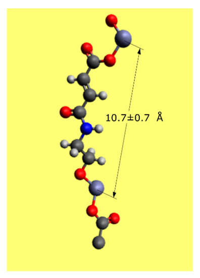 The ideal deposition recipe was found by choosing the shortest purging and exposure times that are still in the saturation regime. This was 0.3/100/4 × 1.5/140/4 × 0.1/100 s for the DEZ/purge/EA/purge/MA/purge sequence, yielding a saturated GPC of 4.4 ± 0.2 Å /cycle. Little deviations in the saturation value are referred to the fact that the sample thicknesses were measured after short exposure to ambient air (5–20 min), yielding different thickness change due to degradation (discussed later). Still, the maximum deviation for the saturated GPC in all saturation curves lies within 10 %. Such thickness deviations can even be observed for films that have been deposited using the same MLD framework conditions. Here and in the following, the precursor exposure times refer to the opening times of the according ALD-valves (Figure 2, valve 1–3). The observed saturated GPC is shorter than the sum of the nominal length of the precursors, which was determined as 10.7 ± 0.7 Å for a single monolayer molecule using the simulation software Avogadro (see Figure 7). The error for this value was calculated from the distance standard deviation obtained from several simulations converging to slightly different optimized geometries.