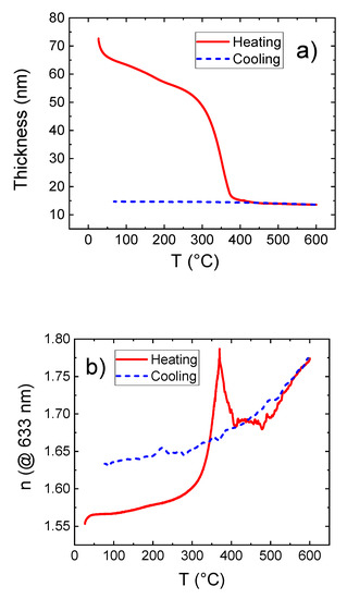 (a) Film thickness and (b) refractive index as a function of temperature measured during a heating cycle 25 °C–600 °C–25 °C on the zinc-organic film.